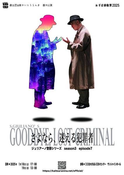 みずほ演劇祭2025参加 劇団芝居屋かいとうらんま番外公演 ジュリアーノ警部シリーズseason3 EPSODE7 「S・ジュリアーノのさよなら、迷える犯罪者」 2025年1月18日(土)17:00 1月19日(日)13:00 ココロかさなるCCNセンターサンシャインホール 一般1500円 中高生1000円 小学生以下無料 ご希望の日時、券種、枚数をご入力ください 演劇祭の通し券になりますので、このチケットで演劇祭すべての公演が ご覧になれます 予約完了後すぐに、自動返信メールが送信されます。 URL付きメールの受信を拒否されている方は、設定を解除してください。