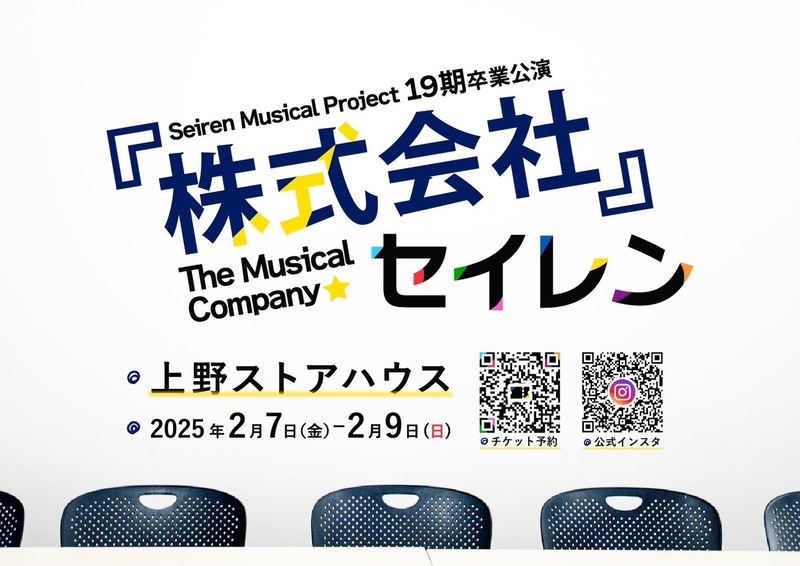 Seiren Musical Project 19期卒業公演 『株式会社セイレン』の予約ページです。公演情報は以下の通りです。 ーーーーーーーーーーーーーーーーーーーーーーーーーーーーーーーー 【公演情報】 2025年2月7日(金)〜2月9日(日) 上野ストアハウス 【公演日程】 2/7(金) 13:30〜 18:30〜 2/8(土) 13:00〜 18:30〜 2/9(日) 12:00〜 16:30〜