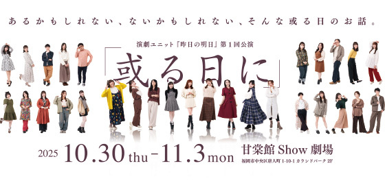 演劇ユニット『昨日の明日』第1回公演『或る日に』 チケットご予約ページです。 ・ご予約完了後すぐに、自動返信メールが送信されます。URL付きメールの受信を拒否されている方は、設定を解除してください。 ticket@corich.jpよりメールをお送りしますので、受信許可設定をお願いいたします。 自動返信が届かない場合は「迷惑メール」フォルダをご確認ください。それでも返信が見つからない場合は、ご予約が入っていない(アドレス記入ミス等)の可能性がございますので、一度、下記メールアドレスまでご連絡ください。 メール→ kinounoashita.fuk@gmail.com ・公演に関する最新情報や緊急のお知らせなどはSNS(X)のユニットアカウントにて発信しております。ご予約をいただく際は、下記アカウントのフォローも併せてお願いいたします。 https://x.com/fuk_engeki ★S席(最前列グッズ付き)チケット 以下の開演回のS席は、 ご好評をいただき定数に達しました! ・10月30日(木) 15:00 〜《teamA》 ・10月30日(木) 19:00 〜《teamB》 ・10月31日(金) 15:00 〜《teamB》 ・11月1日(土) 11:00〜《teamA》 ・11月2日(日)15:00〜《teamA》 ・11月3日(月祝) 11:00 〜《teamB》 ・11月3日(月祝) 15:00 〜《teamA》 ありがとうございます!!