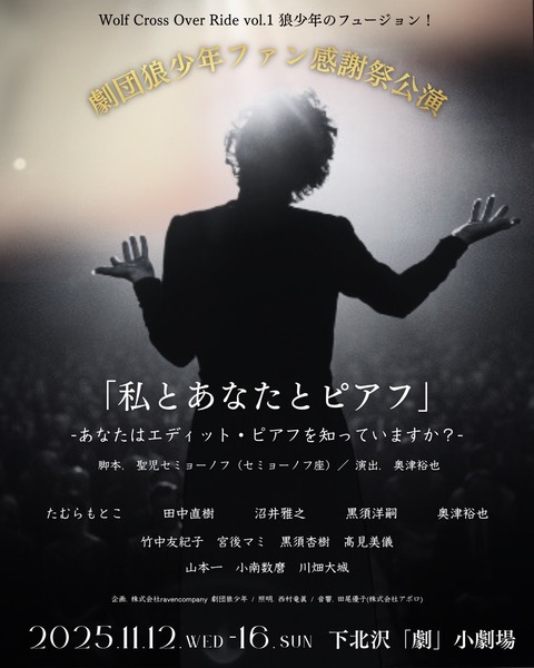 劇団狼少年ファン感謝祭『狼少年のフュージョン』 全国各地で圧倒的パフォーマンスを繰り広げるアーティスト square=circle が演劇界の聖地である下北沢に降臨! 音楽と演劇が交差するコラボライブならではの特別なパフォーマンスをお届けします。 第一部 私とあなたとピアフ 「あなたはエディットピアフを知っていますか」 第二部『square=circle with 狼少年 LIVE』 11月12日(水)19:00⚫︎ 11月13日(木)14:00⚫︎ 11月14日(金)19:00⚪︎ 11月15日(土)13:00⚫︎/ 18:00⚪︎ 11月16日(日)13:00⚪︎ ※⚫︎⚪︎は第一部メインキャストでの出演回です 第二部の音楽ライブには全員が出演します 奥津裕也 竹中友紀子⚪︎ 宮後マミ⚫︎ 黒須杏樹 髙見美儀 田中直樹⚫︎ 沼井雅之⚪︎ 山本一 小南数麿 川畑大城 黒須洋嗣 たむらもとこ 他劇団狼少年&レイブンカンパニーメンバー チケットぴあはこちら ▶︎http://ticket.pia.jp/pia/event.ds?eventCd=2537739 Pコード537829