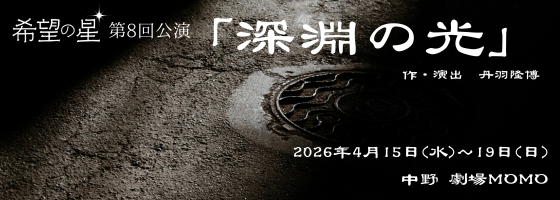 2026年4月15日(水)~19日(日) 希望の星 第8回公演「深淵の光」 作・演出 丹羽隆博 中野 劇場MOMOにて 2026年2月11日(水)12:00よりチケット予約開始! ★2月中のご予約で先行予約特典あり ★4月16日(木)・17日(金)15:00の回は、平日昼公演割引で200円オトク! ※U25割引は平日昼割回も一律3000円となります。 アーカイブ配信公演:予約受付期間【3月1日~5月3日】
