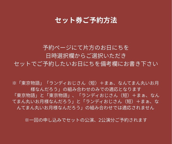 予約完了後すぐに、自動返信メールが送信されます。 URL付きメールの受信を拒否されている方は、設定を解除してください。 ticket@corich.jpよりメールをお送りしますので、受信許可設定をお願いいたします。 🌟セット券のご予約を希望の方へ🌟 片方のお日にちを日時選択欄からご選択いただき セットでご予約したいお日にちを備考欄にお書きください。 ※「東京物語」と「ランディおじさん(短)+まぁ、なんてまん丸いお月様なんだろう」の組み合わせのみでの適応となります。 (「東京物語」と「東京物語」、「ランディおじさん(短)+まぁ、なんてまん丸いお月様なんだろう」と「ランディおじさん(短)+まぁ、なんてまん丸いお月様なんだろう」の組み合わせでは適応されません) ※一回の申し込みでセットの公演、2公演分ご予約されております。
