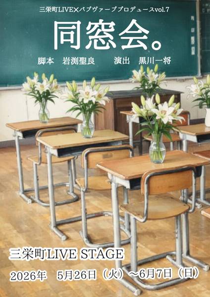 三栄町LIVE×バブヴァーブプロデュースvol.7 『 同窓会。』 脚本:岩渕聖良 演出:黒川一将 公演日:2026年5月26日(火)~ 6月7日(日)全16公演 【あらすじ】 同窓会。 希美はかつてのクラスメイトたちと久しぶりの再会を楽しんでいた。 会は大いに盛り上がり、楽しい同窓会として終わるはずだった、、、。 突如会場に鳴り響く爆発音と地響き。 閉じ込められてしまった10人。 脱出の方法を探していると、全員のスマホから着信音が鳴り響く。差出人は10年前に亡くなったはずのクラスメイト。 早坂葉瑠からのメールだった。 【出演】 Aキャスト 浅井つぐみ ねこはるい 土田ひとみ 千優 甲斐夢実 東海林美南☆【6月5日(金)14:00A公演には出演いたしません】 Bキャスト 水野捺美 駒村優月 玉留汐 仲来深里 高梨未羽 花屋時雨☆【6月5日(金)14:00A公演にも出演いたします】 ABキャスト 上杉美南海★【6日(土)は出演いたしません】 茎田優平 桜庭司 三十正大 みつ姫 おたべ壮太 桜木紗瑛★【6日(土)のみ出演】 【公演日時】 5月 26日(火)19:30A 27日(水)19:30B 28日(木)19:30A 29日(金)14:00B 30日(土)14:00A/18:00B ※配信日 31日(日)13:00B/17:00A 6月 1日(月)休演日 2日(火)19:30B 3日(水)19:30A 4日(木)19:30B 5日(金)14:00A☆ 6日(土)14:00B★/18:00A★ 7日(日)13:00A/17:00B ◎受付開始・開場は開演の30分前 【チケット】 前売り自由席3500円(当日4000円) 配信チケット3500円[生配信、アーカイブ配信で2週間視聴可能] 【会場】 三栄町LIVE STAGE 住所:東京都新宿区四谷三栄町10-12 ボナフラワービルB1階 アクセス:東京メトロ丸の内線「四谷三丁目」4 番出口より徒歩5 分 JR 中央線・総武線「四ツ谷」より徒歩10 分 都営新宿線「曙橋」より徒歩7分 【スタッフ】 宣伝美術:岩渕聖良/仙洞田志織 キャスティング:黒川一将/三栄町LIVE 制作:松尾智久 制作指揮:小畑幸英 プロデュース:黒川一将 企画・制作:三栄町LIVE 協力:アミティープロモーショ/ジャストプロボイス/sunaba(五十音順・順不同) 【お問い合わせ】 三栄町LIVE info@3eicholive.com 三栄町LIVE HP http://3eicholive.com/